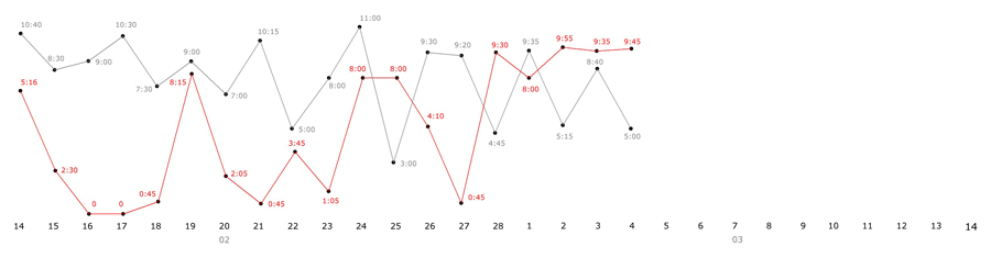 На графике внизу красным - сколько работаю, серым - сколько сплю. В планах довести красную до 15 часов =).